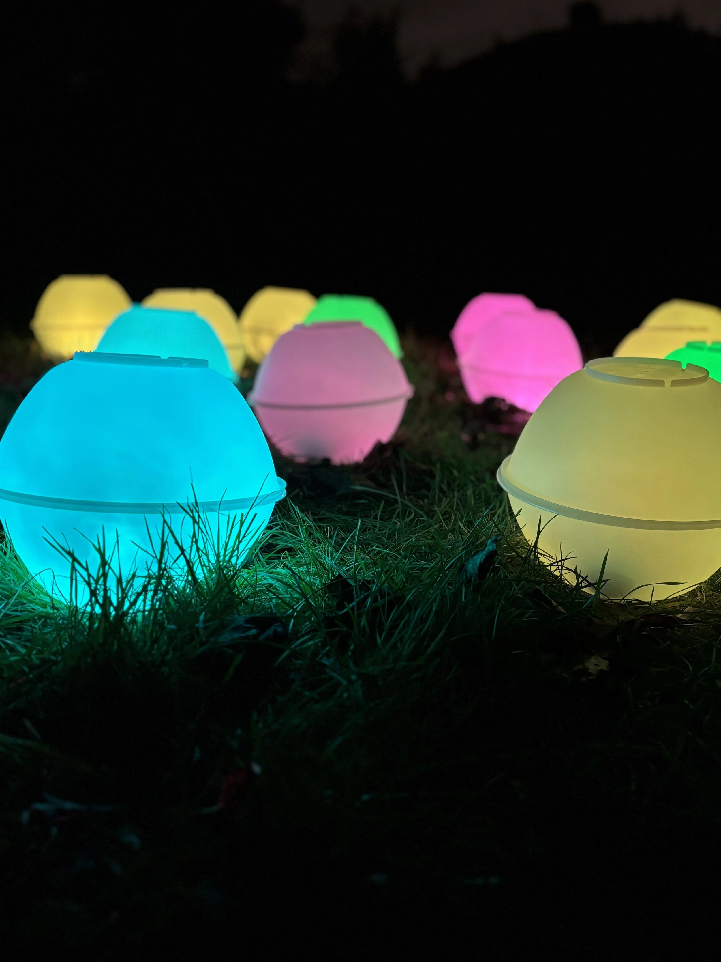 Utilising household plastic bowls the re-chargable lights emit a warm glow